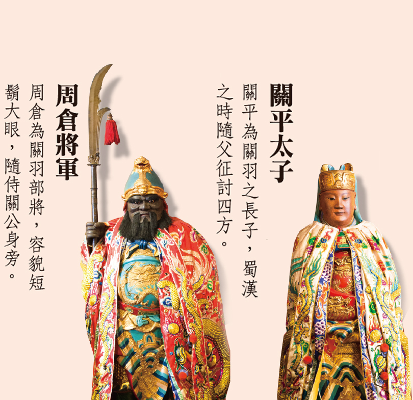 同時期左右兩側,塑關平太子與周倉將軍立像,前排居中為開基二關帝、左為三關帝、右為五關帝,前排神尊龍面有關聖帝君大印。正殿圍欄邊上桌居中奉祀四關帝、三官大帝等神尊。
