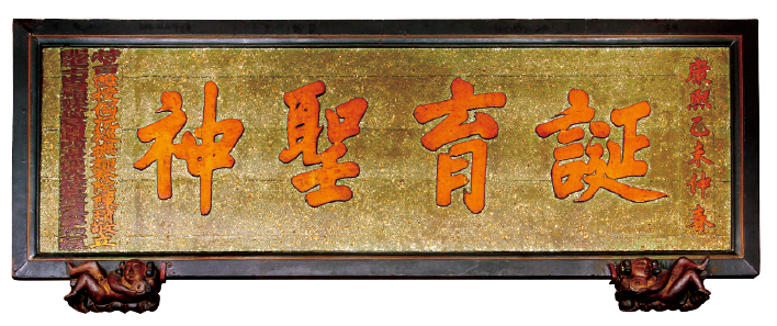 樑上《誕育聖神》匾推崇關公祖輩教養功高。三代廳除供奉關帝爺祖輩三代,另祀修繕武廟有功及勤政愛民的清代官員